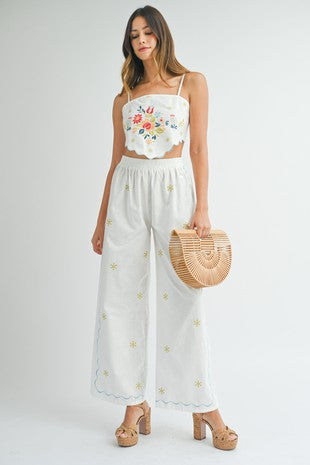 Linen mix floral embroidered detail handkerchief scarp top and matching elastic waistbands pants set.