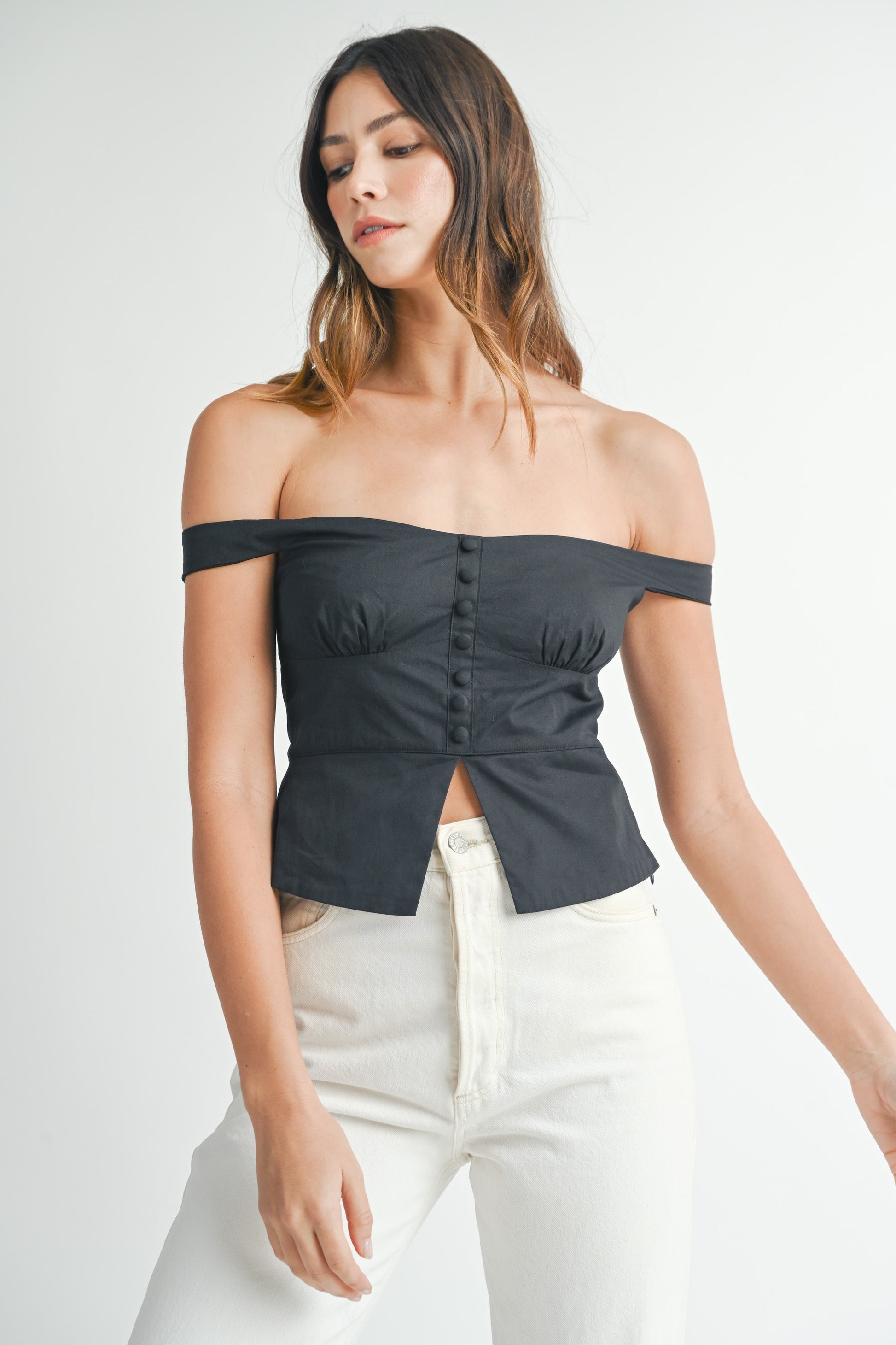 This poplin off shoulder peplum top is both stylish and versatile. It offers a comfortable and trendy off-shoulder design, making this top perfect for both casual and formal occasions.